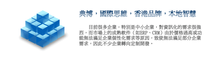 典博系統國際有限公司成立於 1997 年香港(其前身是展時企業有限公司 於 1990 成立),已有近20年程序編寫經驗。典博專注于軟件定制開發,將先進的信息技術融合到香港以及一些跨國企業的管理和業務中,使這些企業隨市場變化隨需應變。