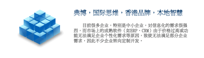 典博系统国际有限公司成立于 1997 年香港(其前身是展时企业有限公司 于 1990 成立),已有近20年程序编写经验。典博专注于软件定制开发,将先进的信息技术融合到香港以及一些跨国企业的管理和业务中,使这些企业随市场变化随需应变。