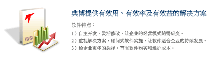 | 典博的套装软件是不同于其它公司的,其本身也是定制开发的,只是套装软件具有某些行业特性,而且为了便于展示和快速开发,我们可以叫中间产品。所以当客户购买了套装软件后,我们很快就可以制作出客户所在行业的软件模型,进而根据公司本身的特点和优势开发独特模块,那么客户得到的经典套装就是独一无二的系统,在行业中也将独树一帜,发挥自己的优势。 |