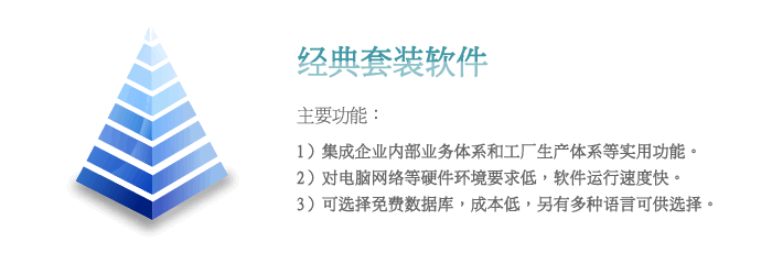 | 典博的套装软件是不同于其它公司的,其本身也是定制开发的,只是套装软件具有某些行业特性,而且为了便于展示和快速开发,我们可以叫中间产品。所以当客户购买了套装软件后,我们很快就可以制作出客户所在行业的软件模型,进而根据公司本身的特点和优势开发独特模块,那么客户得到的经典套装就是独一无二的系统,在行业中也将独树一帜,发挥自己的优势。 |