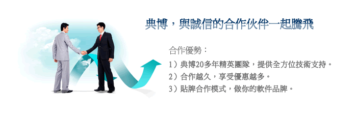 | 典博Timford作為香港優秀的企業軟件商,2009年全力向國內發展,我們建立渠道合作體系,提供多種合作方式,讓利于合作伙伴以及匯聚資源、成就商機是我們的責任。合作加盟補充了直銷模式無法觸及的用戶,在共贏的基礎上,典博提供強有力的技術,支持合作伙伴共同開拓市場、獲取商機。目前典博的合作模式有三種(代理分銷、項目合作、貼牌合作),每種模式分級別為:核心、金牌、銀牌。 |
